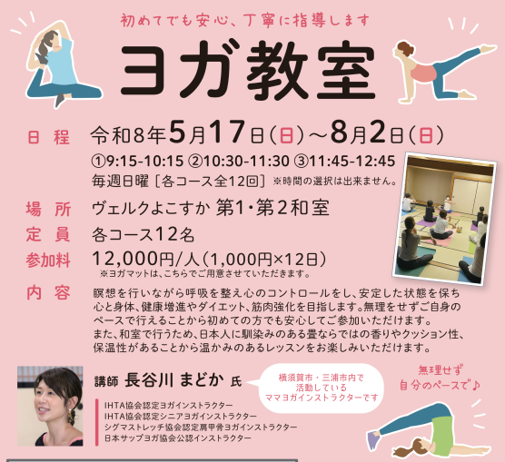 新しい季節、自分自身の体とじっくり向き合う時間を作ってみませんか。横須賀中央駅から徒歩圏内のヴェルクよこすかにて、2026年5月17日から日曜開催の「ヨガ教室」が始まります。全12回のプログラムで、呼吸を整えながら健康増進やリフレッシュを目指せるのが嬉しいポイントですね。